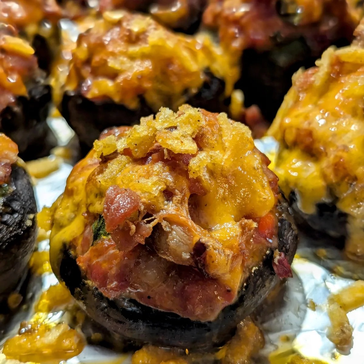 - Bacon. Crisp-cooked bacon mixed with cheddar is used for the topping on the mushrooms when they are in their final minutes.